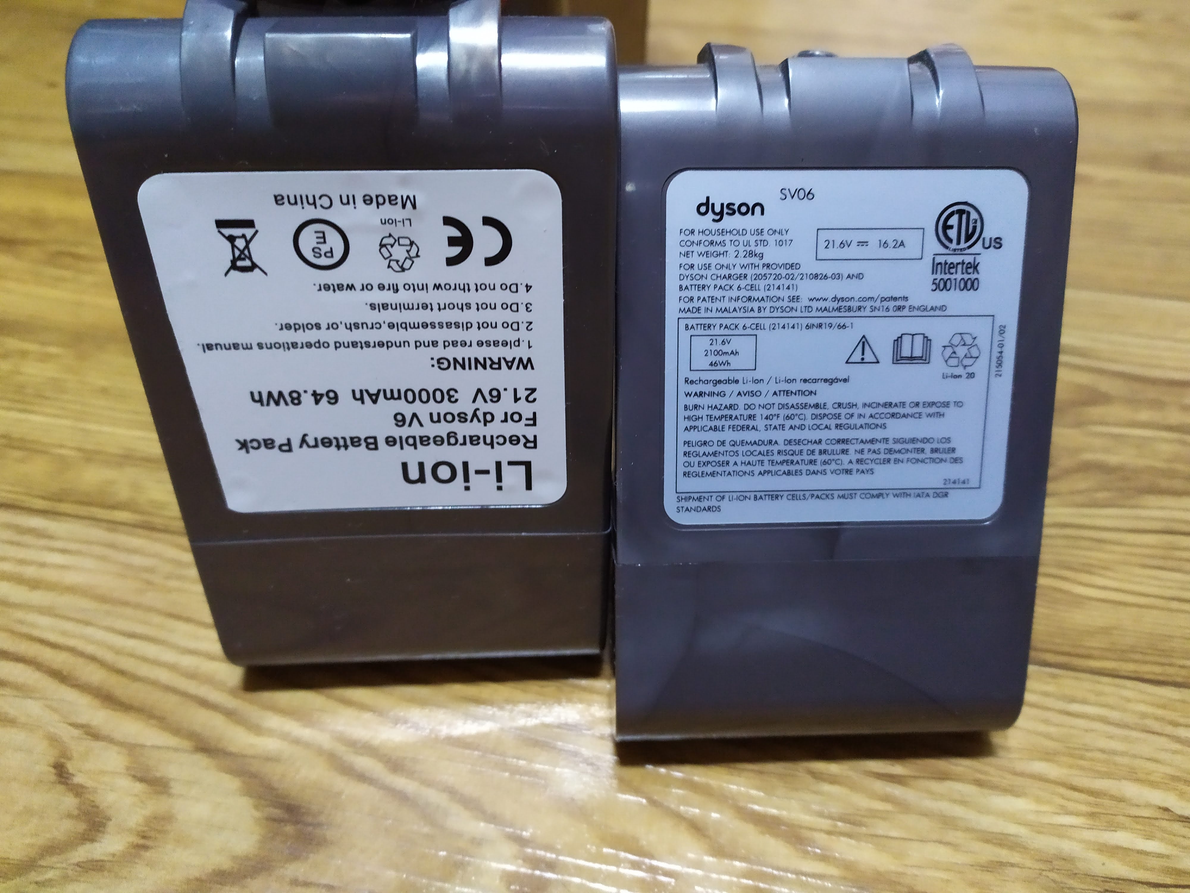 배터리 교체 하고 찍은사진 왼쪽이 호환배터리 오른쪽이 정품 다이슨 배터리