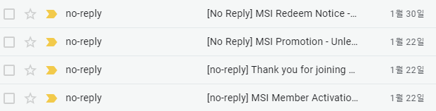 22일날 MSI 홈페이지 가입하고 계정 활성화 시키고, 리딤코드를 신청한 흔적