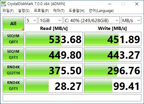 마이크론 크루셜 mx300 750Gb 크리스탈디스크 마크 속도 결과
