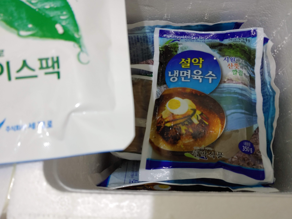 아이스박스에 포장 잘되어 왔다. 물냉면 육수 얼음도 남아 있음.
